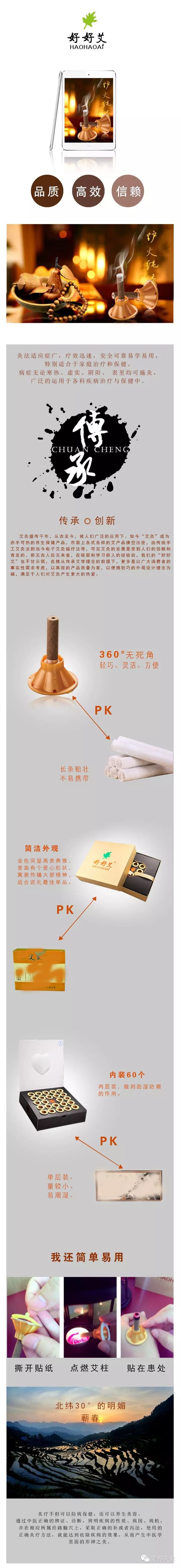 艾灸盛传千年,从古至今,被人们广泛的应用下。如今“艾灸”成为赤手可热的养生保健产品,市面上各式各样的艾产品横空出世,由传统手工艾灸法到当今电子艾灸磁疗法等,可见艾灸的发展是受到人们的信赖和肯定的。前无古人后无来者,在吸取和学习前人的经验后,我们的“好好艾”也不甘示弱,在推从传承艾学理念的前提下,更多是以广大消费者的事实性需求考虑,以高效的产品质量为首,以便携轻巧的外观设计理念为辅,满足于人们对艾灸产生更大的热爱。