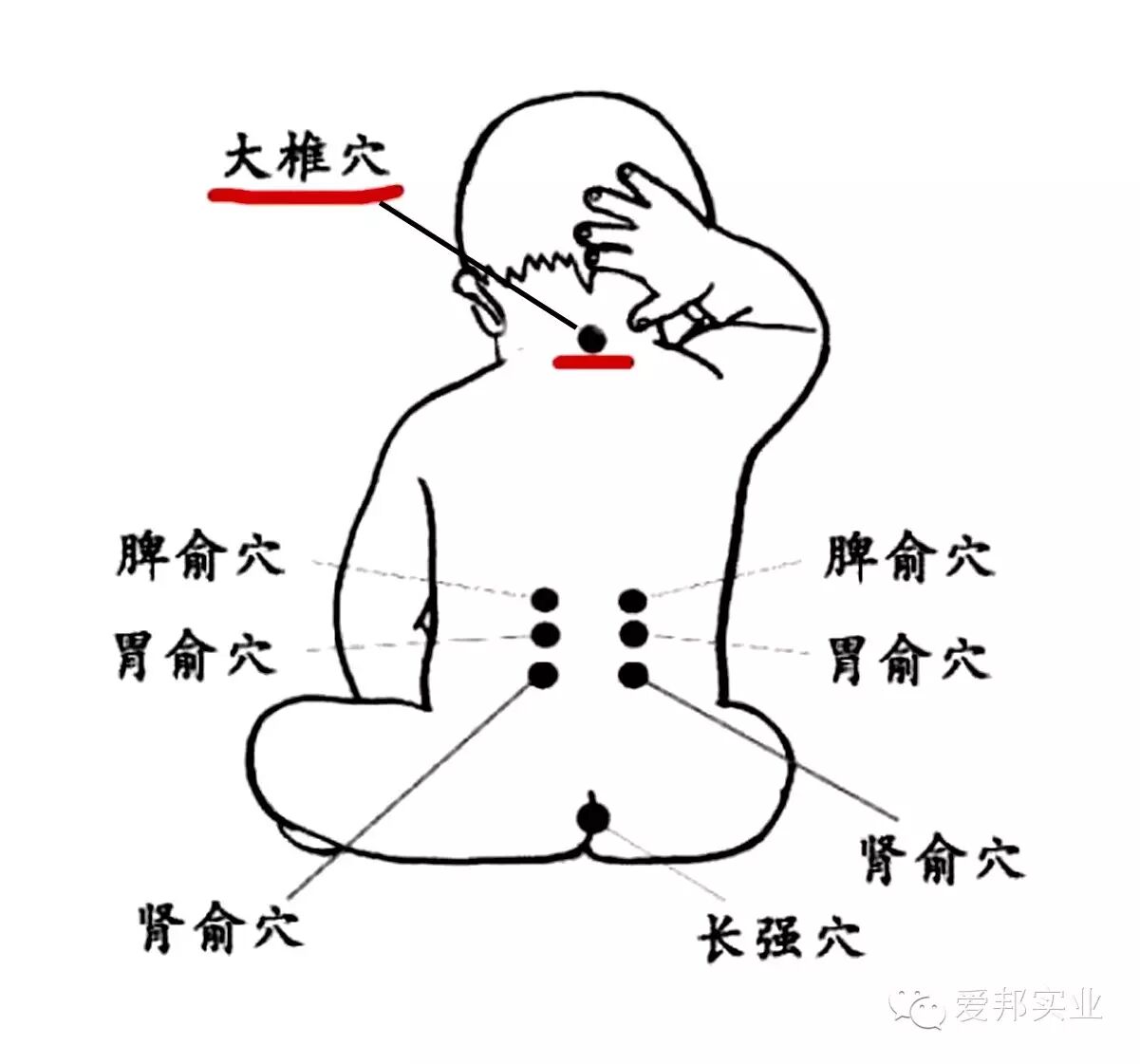 大椎属于督脉,有通督行气,贯通督脉上下的作用。感冒发烧,过敏性疾病治疗取穴大椎是首选,也是治疗寒冷疾病的主要措施。第一次灸,妈妈们记得观察湿气有没有被逼出来,如果高烧明显退下了,可不用再灸,但15分钟后没明显变化,可再灸一遍,灸完喝点温开水,把被子盖好,出一场汗之后就好了。