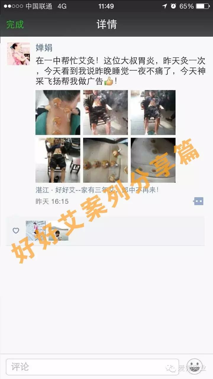 其实还有很多临时的情况,如开会到半、开车到半、工作到半等等现象,因为痛而要面临的尴尬情况。胃炎病症不分年龄大小,是由于现在生活节凑加快,很多人不健康的饮食习惯,导致胃不舒服,频繁上厕所等,西药对胃刺激大更不好,所以胃只能靠平时调养。艾灸可以帮助摆脱胃炎的困扰。下面看看这位大叔就是“好好艾”的最大受益者。